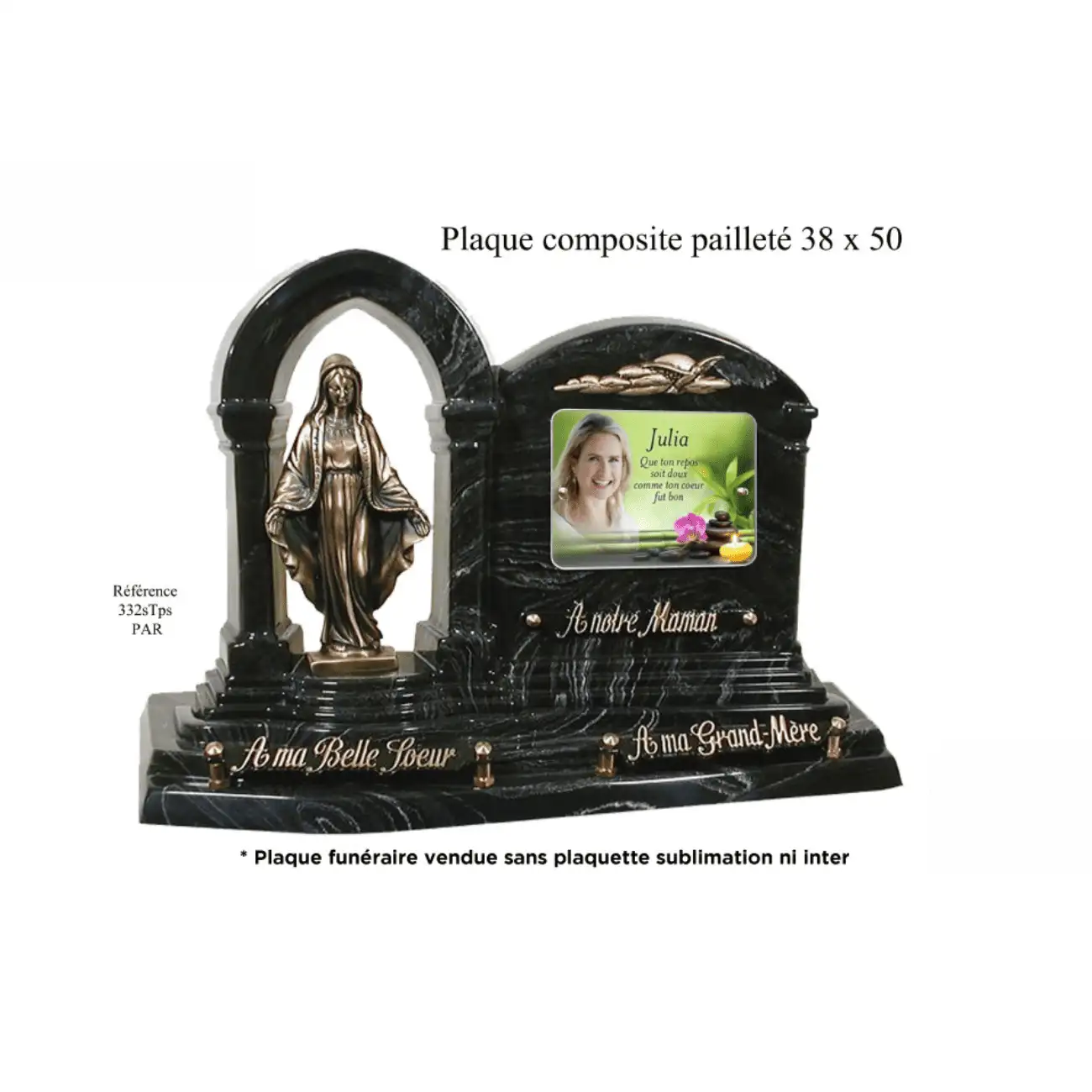 Cette plaque funéraire en forme d’arche, délicatement pailletée et ornée de la Vierge, est un hommage empreint d’amour et de spiritualité. Plus qu’un souvenir, elle est l’expression d’une foi profonde et d’un lien impérissable avec l’être cher.
