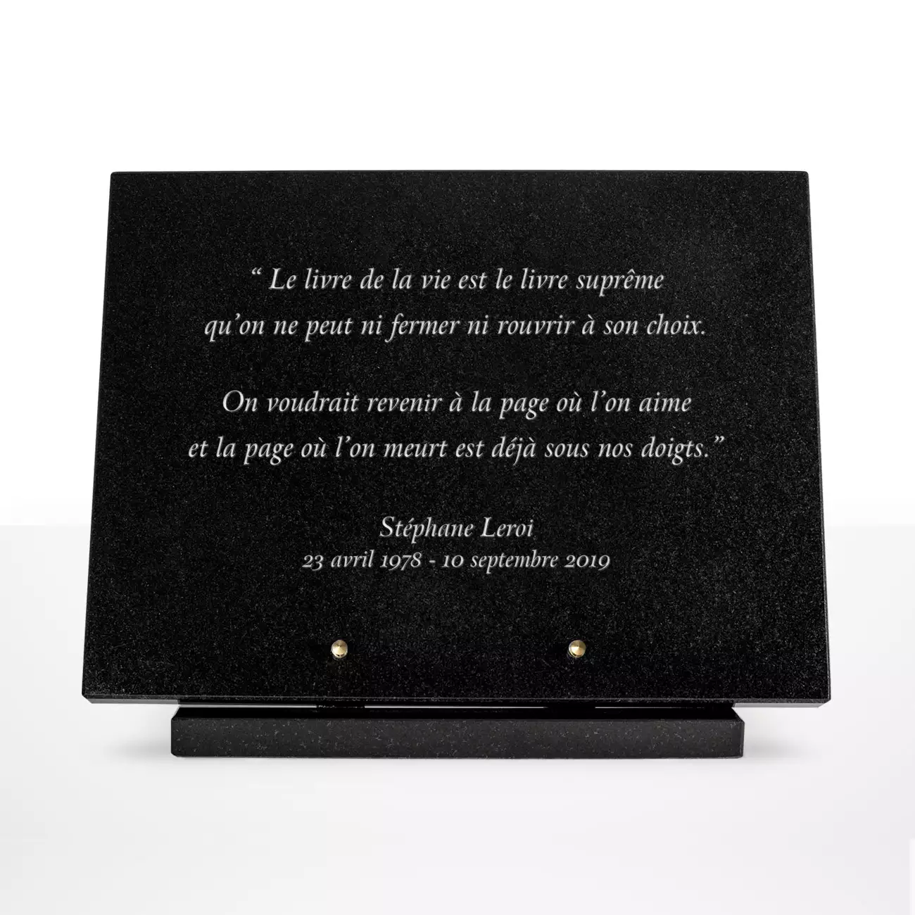 Pour un hommage traditionnel, optez pour notre plaque funéraire en granit que nous avons remis au goût du jour. Avec notre matériel de gravure dernière génération, votre pouvez graver sur votre plaque funéraire un dernier message touchant ou encore une citation. Nos plaques mortuaires en granit sont systématiquement habillées d’un socle en granit noir.