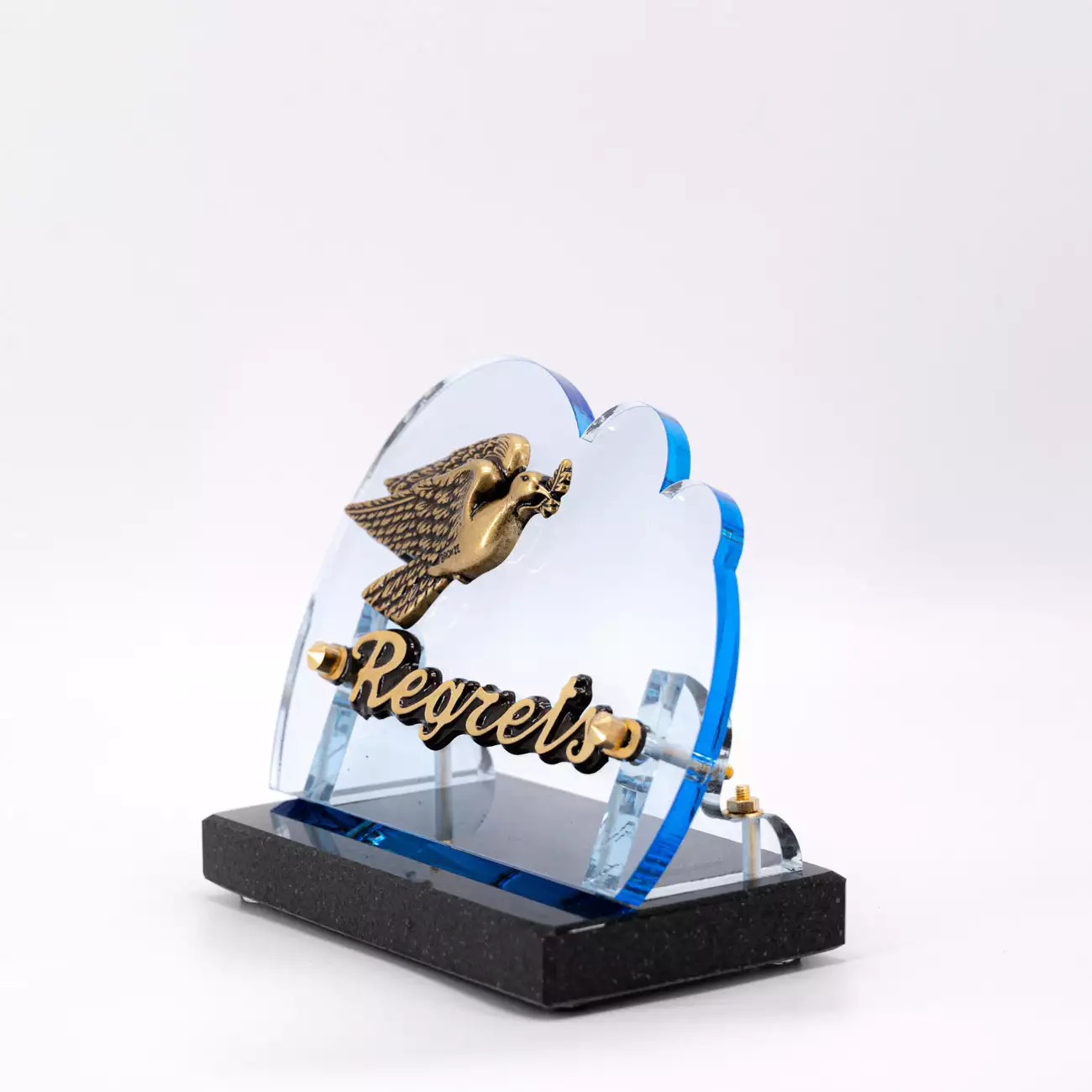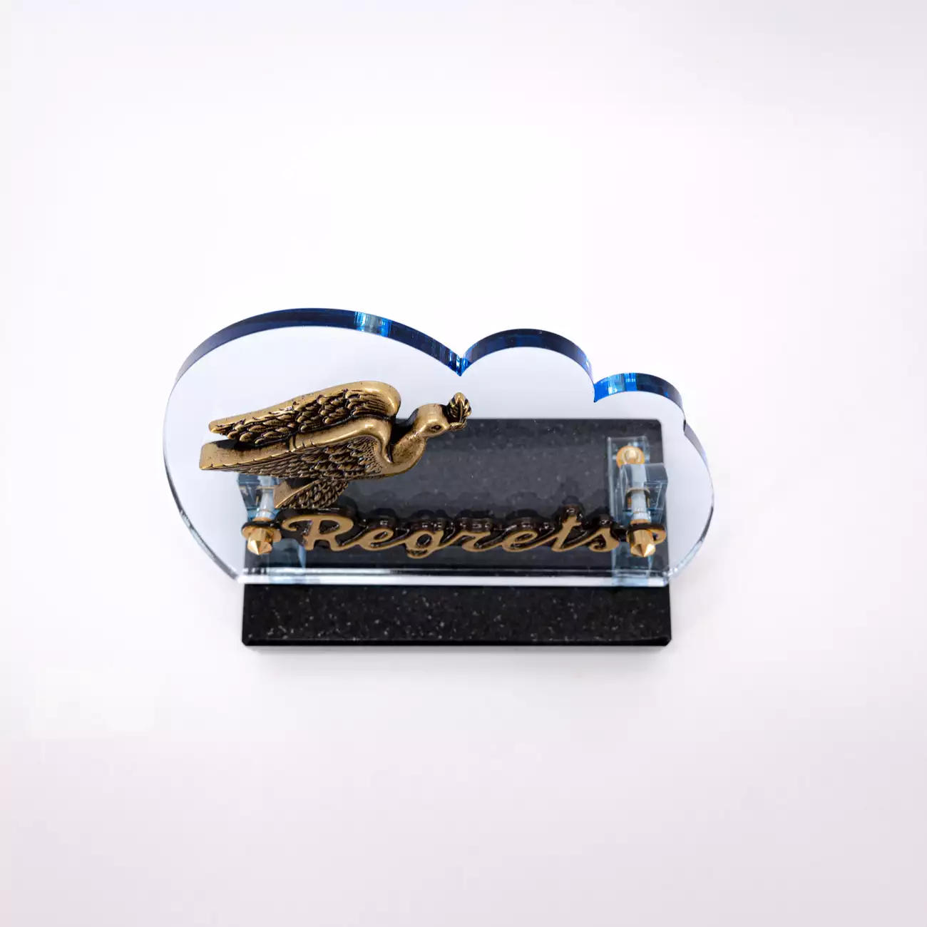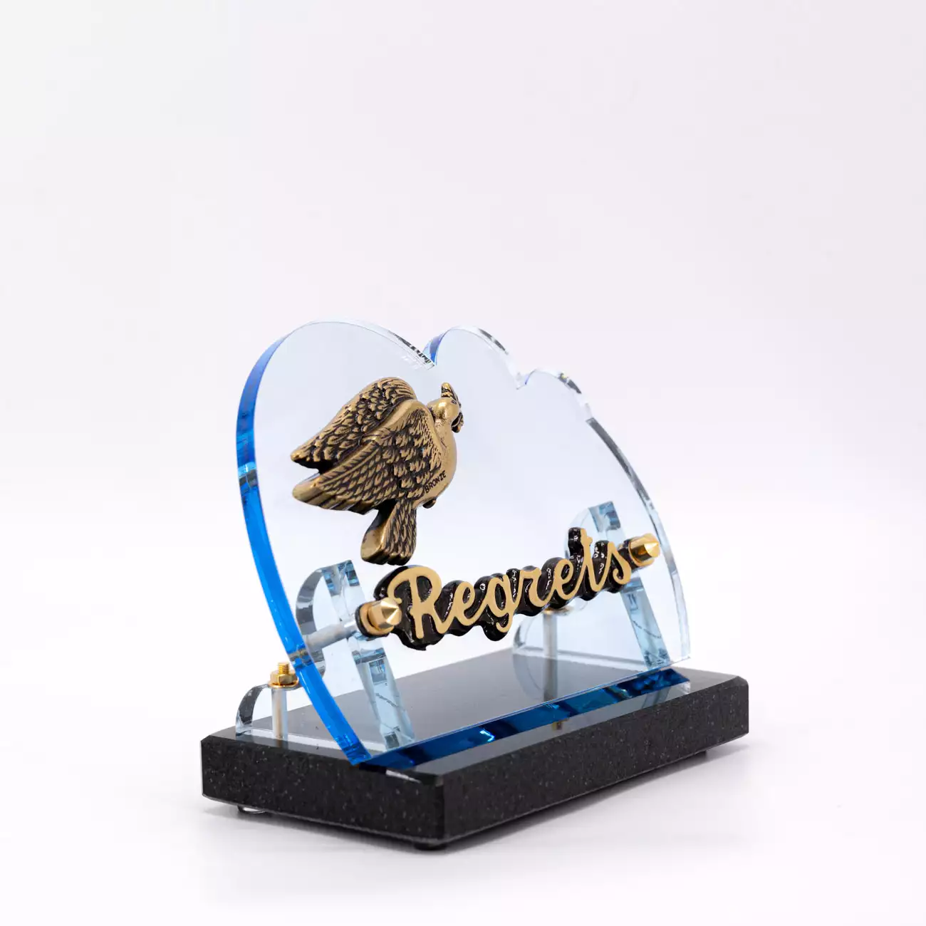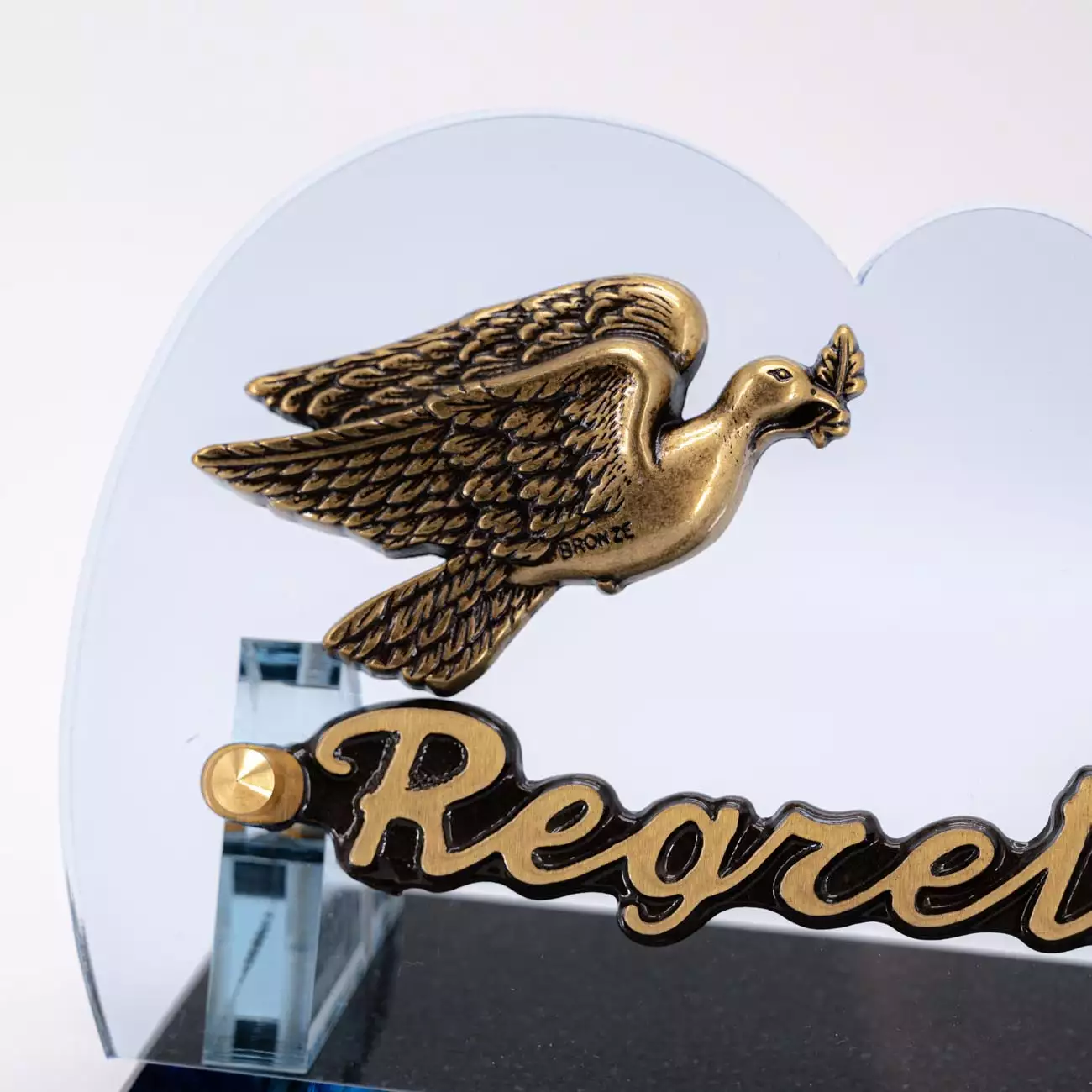 Son visuel raffiné représente une colombe en bronze, emblème universel de paix, de pureté et d’envol de l’âme vers un monde meilleur. Le fond en altuglas transparent ajoute une touche de modernité, évoquant la légèreté et l’élévation.