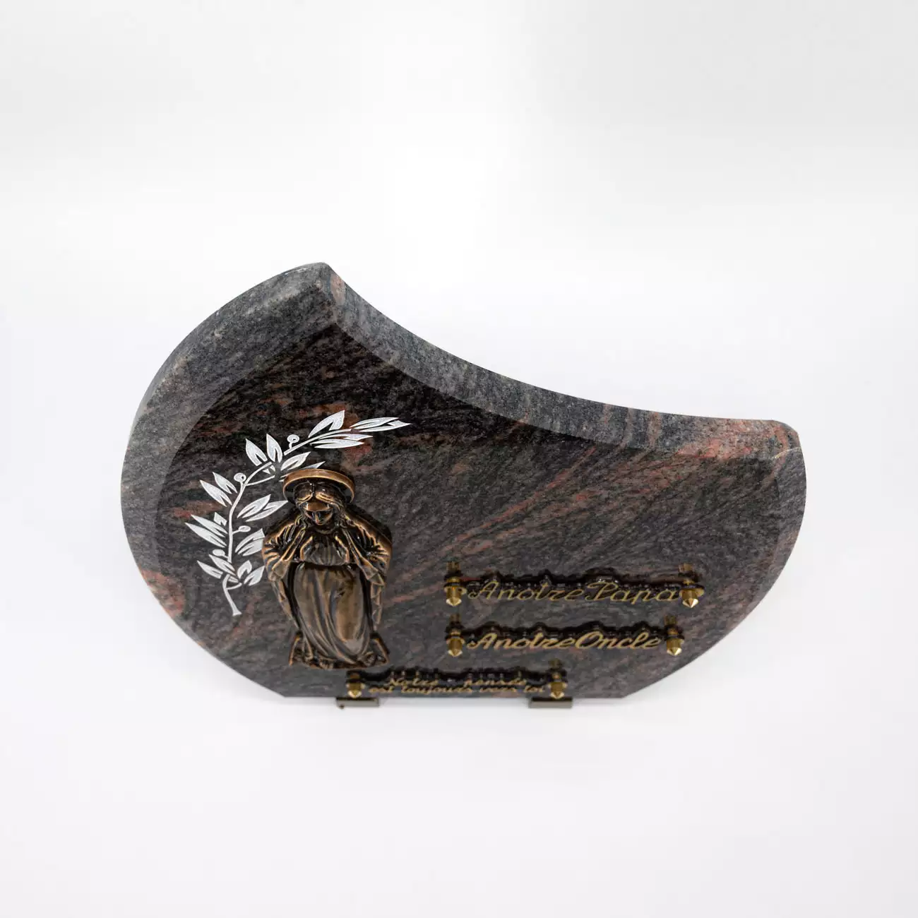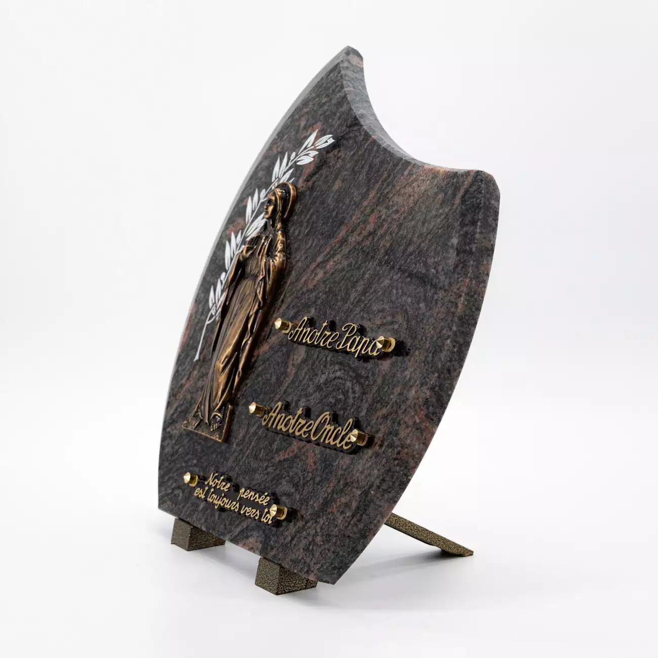 Fabriquée en France avec le plus grand soin, cette plaque cimetière religieuse repose sur des équerres en métal assurant une excellente stabilité. Les 3 inters en bronze personnalisables vous permettent d’y inscrire un message personnel ou un texte standard, selon vos souhaits.